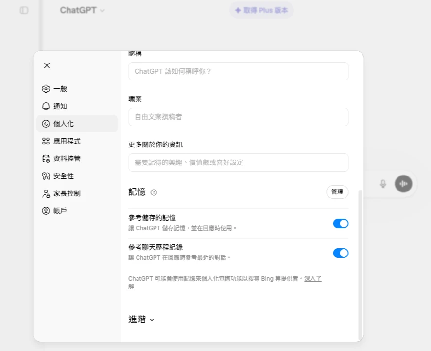 在應用程式的「設定」中的「個人化」選項中,你還可以輸入自訂的行為和語氣指令,以及個人興趣和其他偏好。