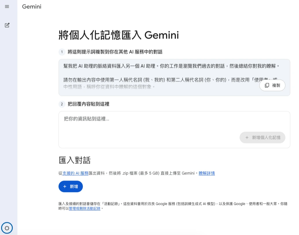 在Gemini設定中,點選「將個人化記憶匯入Gemini」。按照建議的提示語輸入到你目前的聊天機器人。當其他應用程式產生回覆後,你可以複製回覆內容並貼上回Gemini。