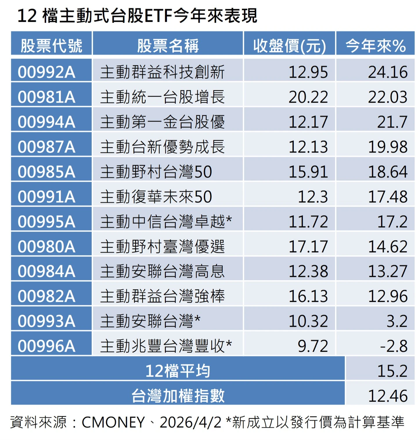 【記者吳珍儀/台北報導】4月第一個交易日台股大漲1458.13點,創下史上單日第二大漲點,一掃近日連跌陰霾,第二個交易日隨即大跌602.39點;台股近期的劇烈震盪,也讓投資人不知如何介入,不過,觀察市場投資新寵12檔主動式台股ETF今年來平均上漲15.2%表現勝大盤12.46%,以單檔表現來看,更是有10檔打敗大盤,其中主動群益科技創新00992A今年來漲幅24.16%居冠。
