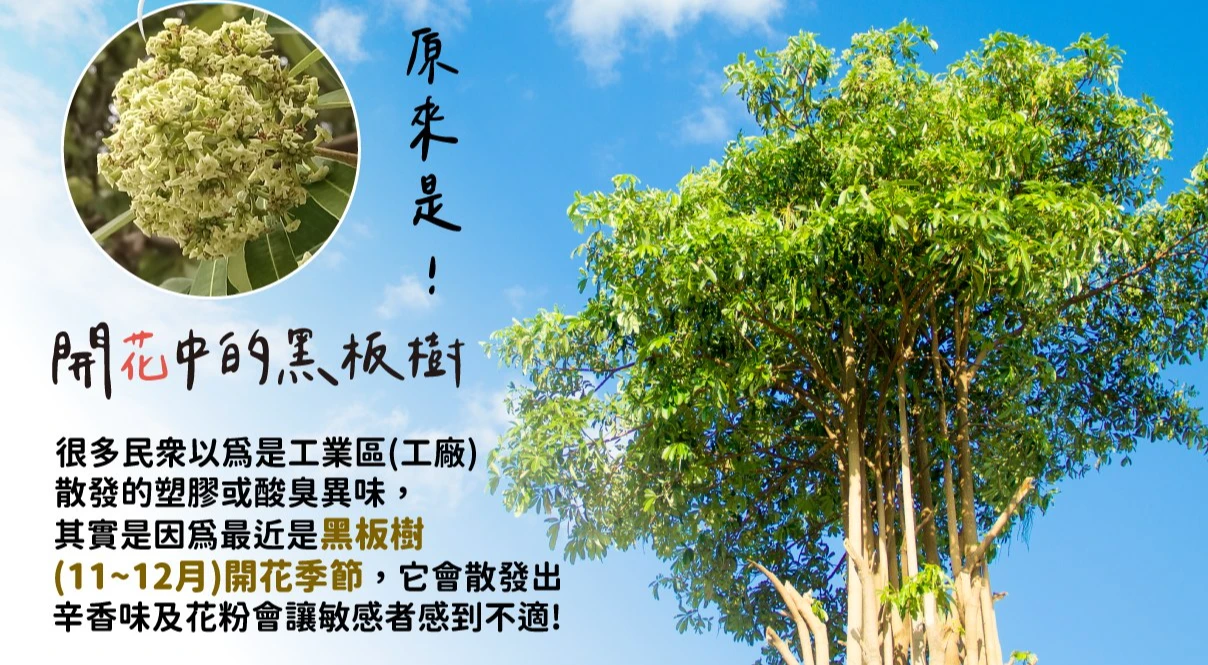 台北市環保局表示,黑板樹是台北市常見的行道樹之一,因為生長快、樹形高大又能耐污染而被廣泛種植。但每年11~12 月左右開花時,花朵會釋放出類似「燃燒塑膠」的特殊氣味。加上入夜後空氣流通差、味道不易散開,就容易讓人誤會是有人在亂燒東西。