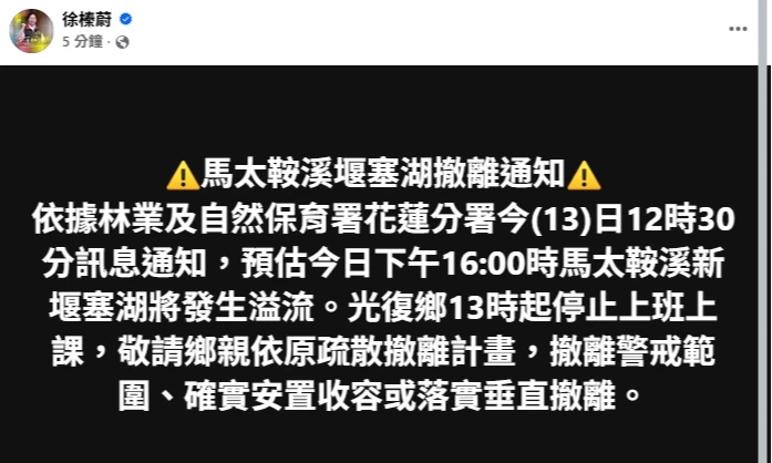 徐榛蔚今中午在臉書發文「馬太鞍溪新堰塞湖撤離通知」,依據林保署今12時30分通知,預估下午4時馬太鞍溪新堰塞湖將發生溢流。縣府宣布光復鄉下午1時起停止上班上課,將依原疏散撤離計畫,撤離警戒範圍、確實安置收容(原收容所)或落實垂直撤離。