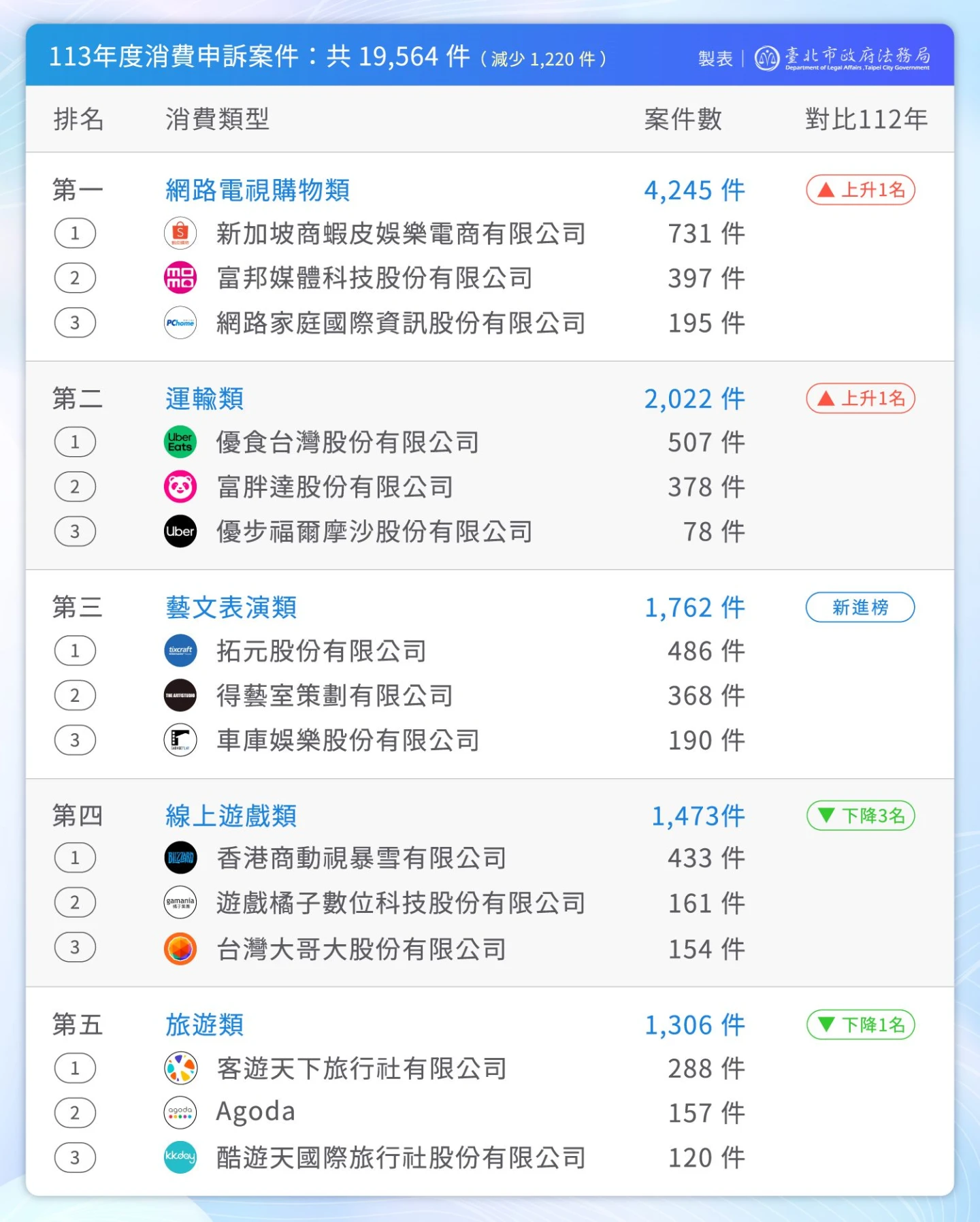 台北市政府法務局公布113年度台北市受理消費申訴及申請調解案件統計結果,113年度申訴案件共計19,564件,較前一年(112年)20,784件略降。消費爭議最多之五大類型依序為網路電視購物類、運輸類、藝文表演類、線上遊戲類及「旅遊類」。