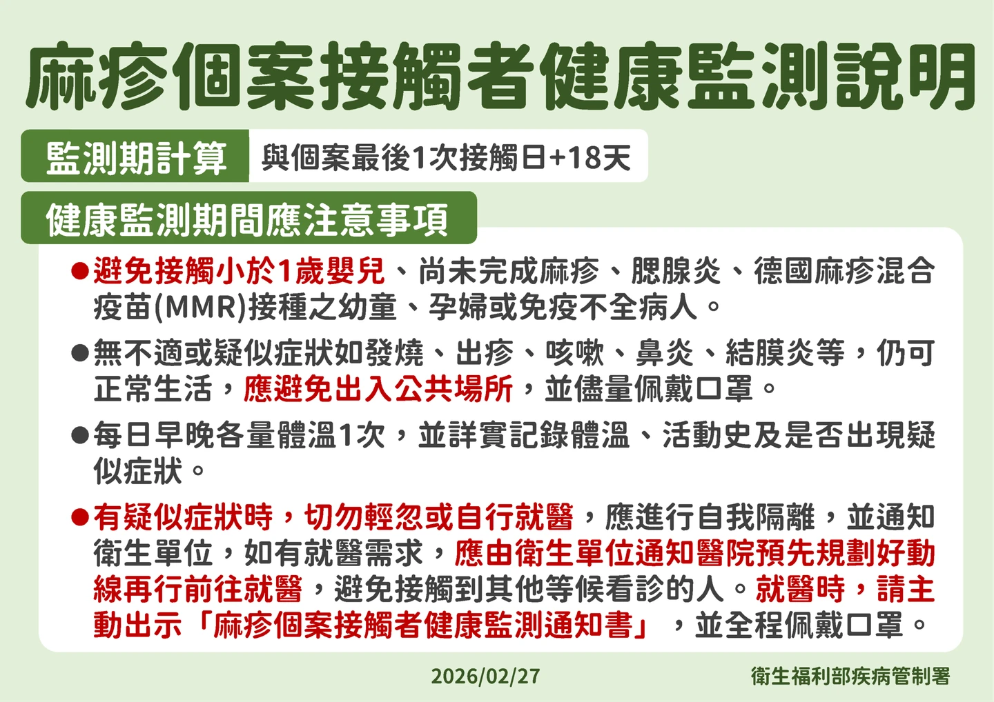 麻疹個案接觸者健康監測期間注意事項。疾管署提供