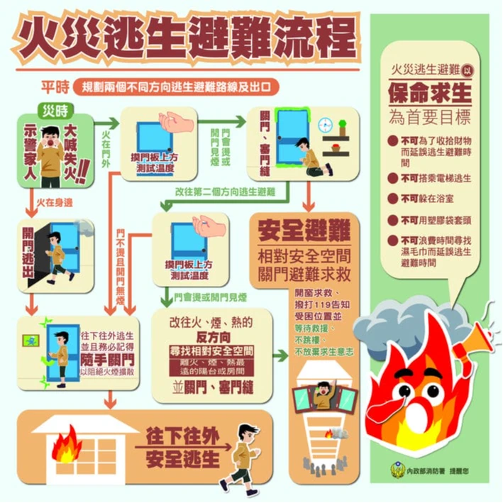 火場最重要的原則是儘速離開建築物,並以「往一樓、往外」為首選方向。開門前應先觸摸門板上方確認是否高溫,同時從門縫觀察是否有濃煙;若高溫或外有煙霧,務必關門並用衣物封住門縫,改尋其他路線。因煙每秒上升3~5公尺、人每秒僅能上升0.5公尺,切勿往上跑。