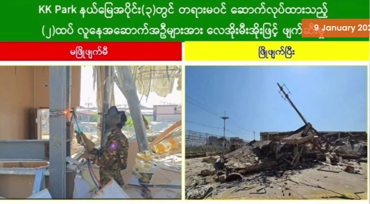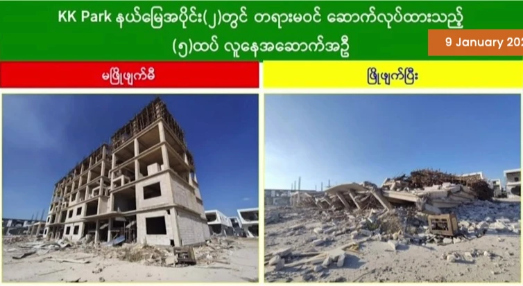 MITV報導,根據官方公告,這項代號為「淨化國境」的行動針對位於泰緬邊境妙瓦底(Myawaddy)地區的KK園區進行了分區清理。數據顯示,軍方與相關部門先前已精確拆除園區內共633棟非法建物,並已於本周四(1/8),將最後2棟位於第二區(Area 2)的五層高大樓完成最終爆破。