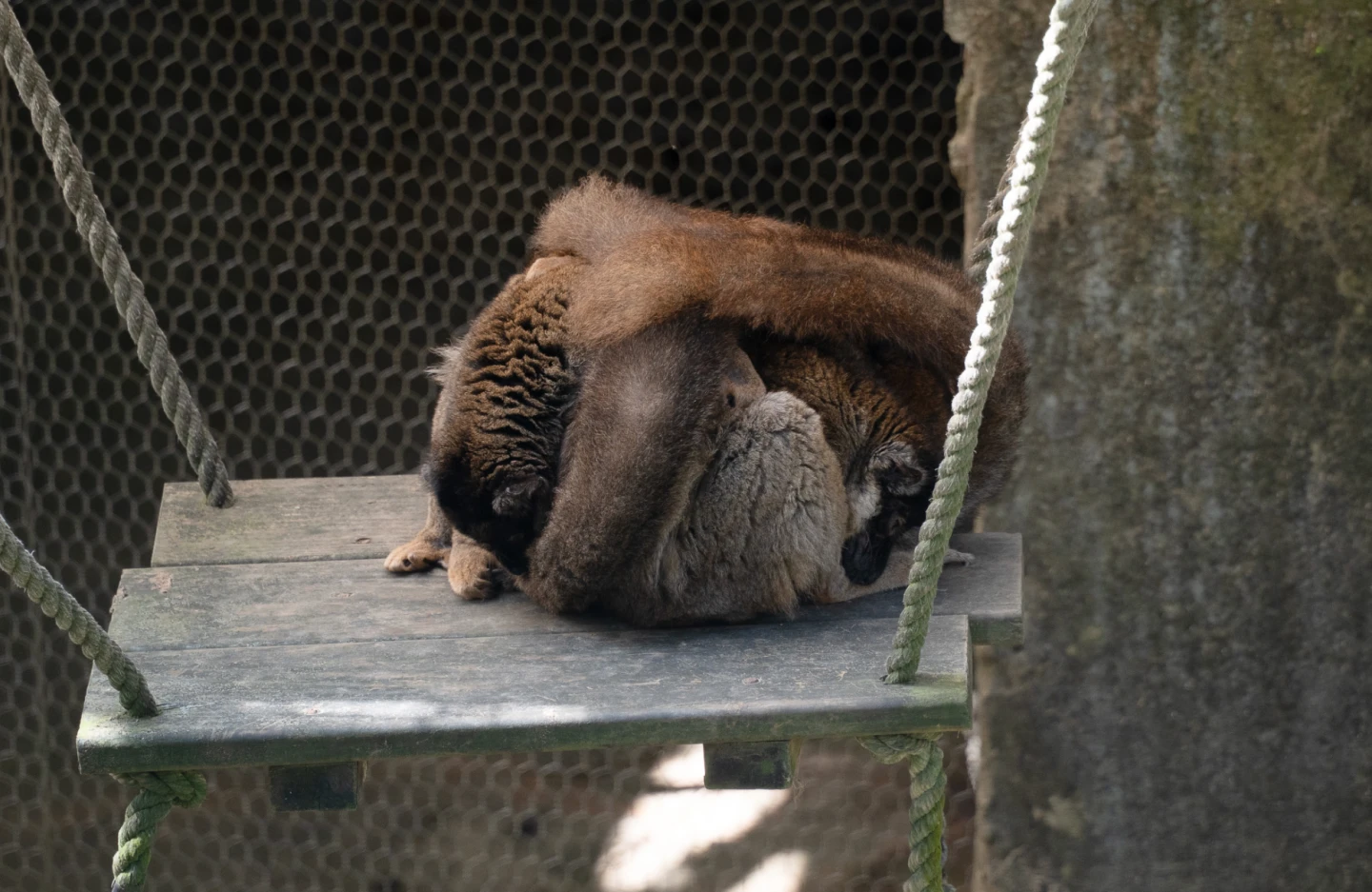 白頸狐猴的日光浴則是慵懶寫意風格,躺臥在草地,眼睛在陽光下微微瞇起,攤開四肢像「大」字般,確保胸口和腹部能最大面積曬到溫暖陽光。褐狐猴也會找到空曠的高處曬太陽,不過牠們做完日光浴後的行為相當特殊,在冬天可以觀察到褐狐猴「團抱」取暖,將長尾巴蓋在彼此身上,形成一顆巨大的毛球,透過減少體表散熱來共同抵禦寒風,可說是褐狐猴界的「毛團」。