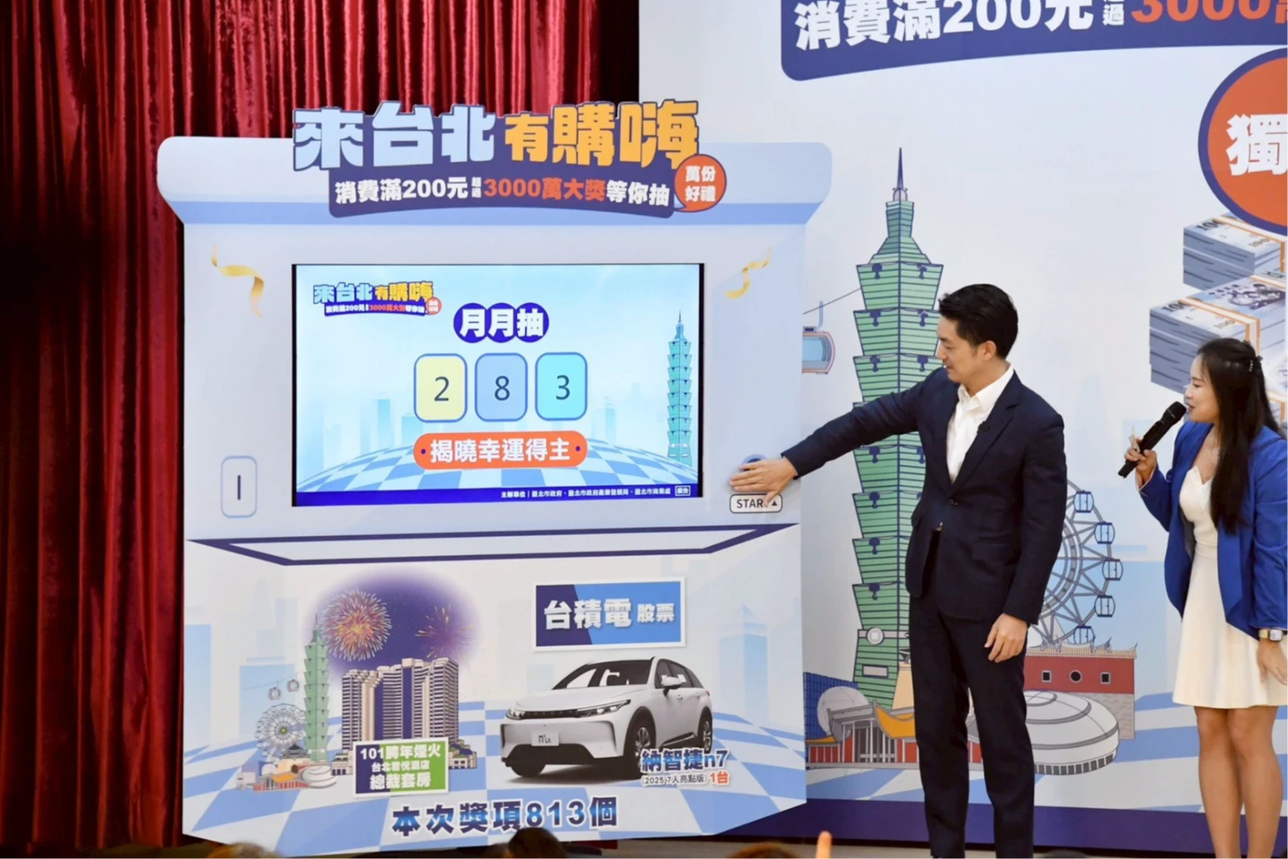 【記者許皓婷/台北報導】配合中央普發萬元政策,北市府推出「來台北有購嗨 消費歡樂抽」抽獎活動,自114年11月11日起至115年3月8日到臺北市店家消費,每滿200元就有一次抽獎機會,今(18)日抽出「月月抽」首批幸運得主,包括台積電股票一張、君悅101跨年煙火總統套房與LUXGEN n7電動車等超值大獎;活動迄今累積登錄金額將逾10億元,北市府除宣布加碼抽美國雙人來回機票外,只要民眾於耶誕至跨年的歡樂節慶期間消費(114年12月24日至115年1月1日),抽獎機會再翻倍!