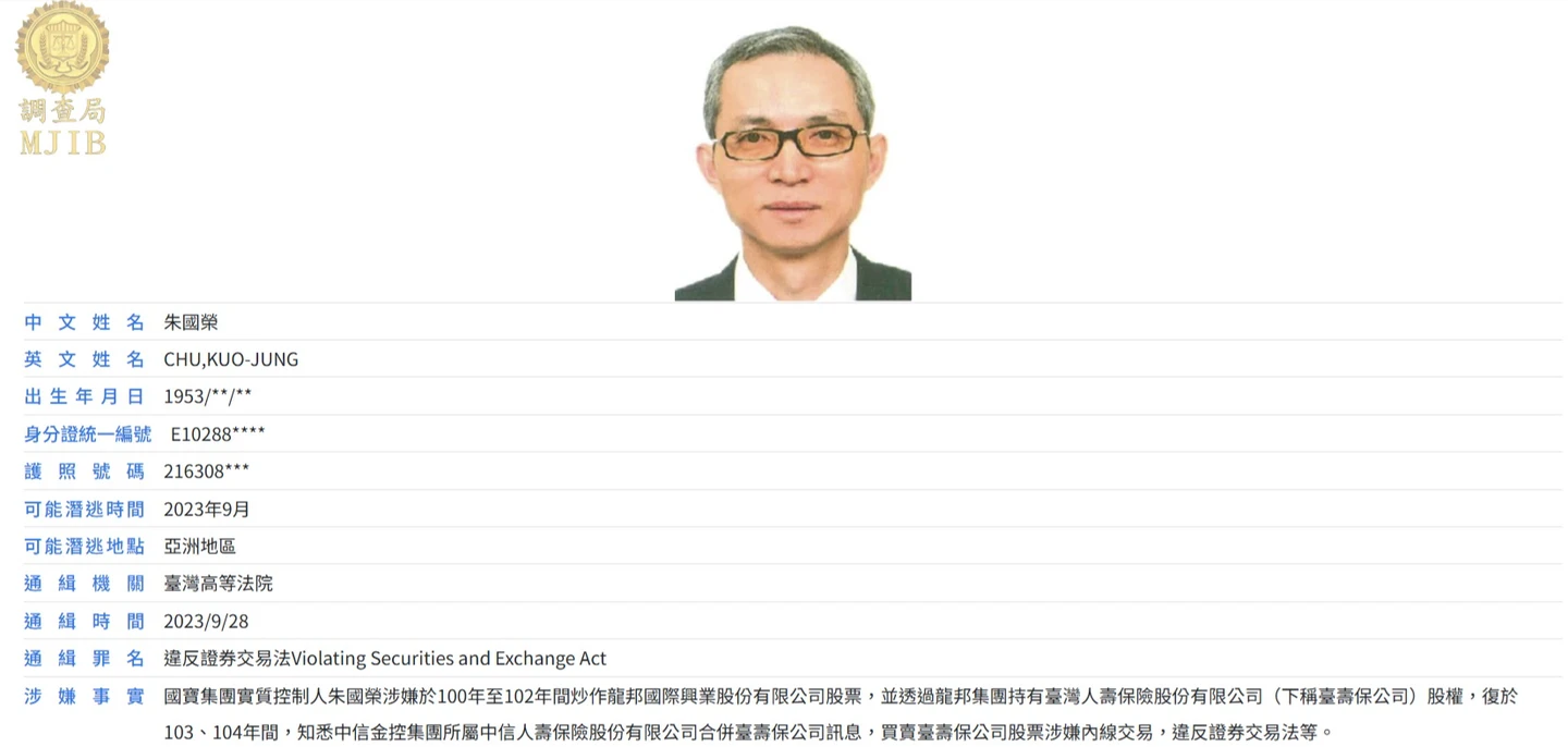 國寶集團總裁朱國榮因涉掏空、內線交易及炒股等案,2案2023年各被二審判刑8年、16年,遭限制出境且須每天到派出所報到的朱男,隨即於2023年9月7日搭遊艇棄保5億元潛逃國外。