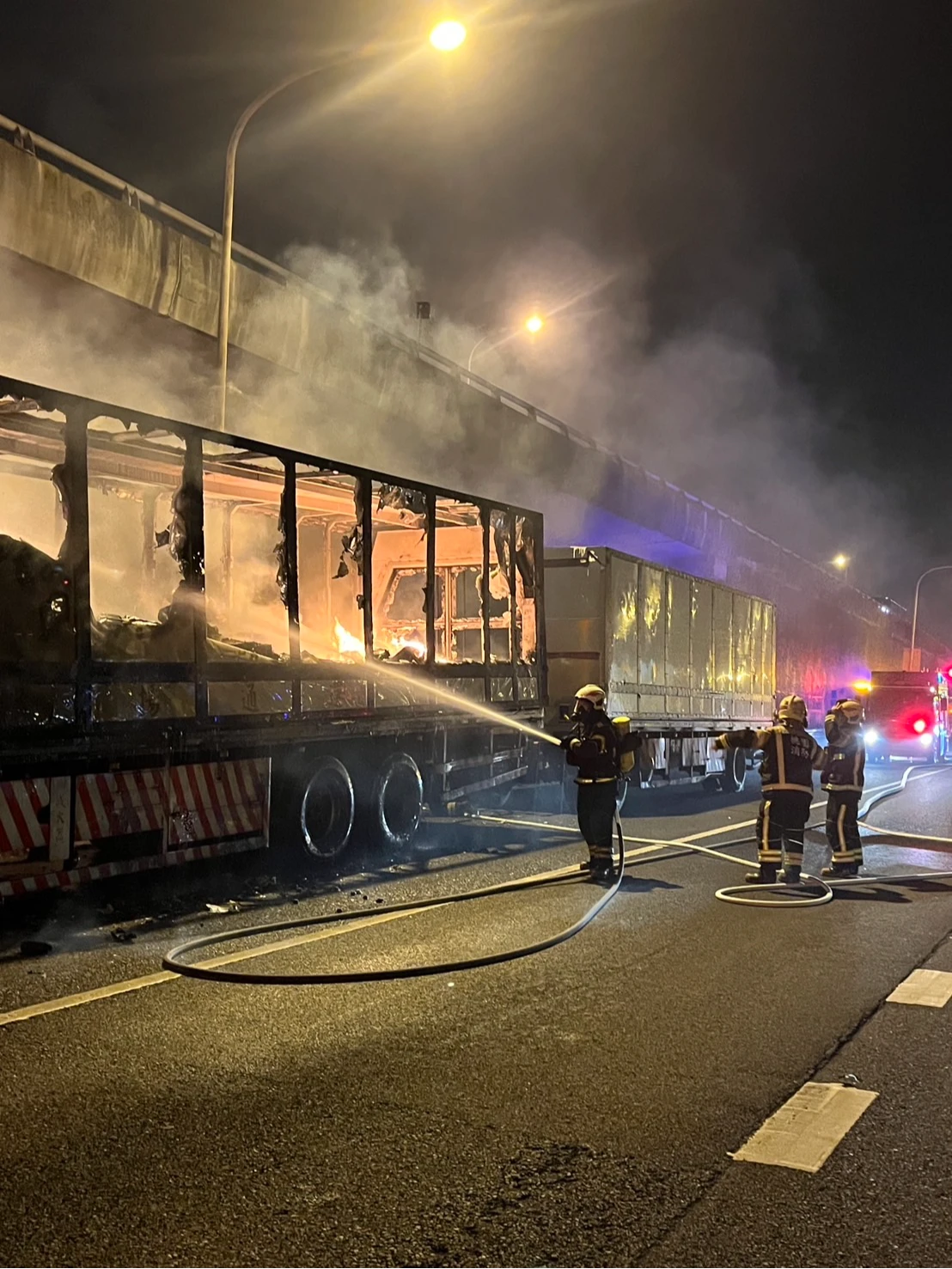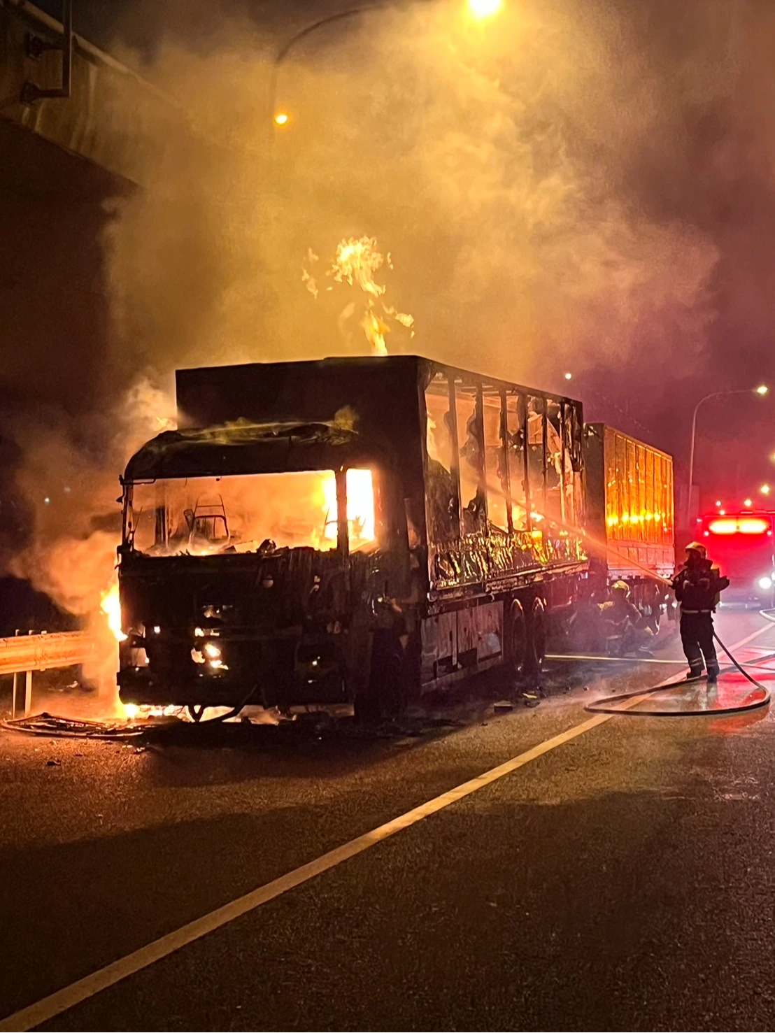 據悉,林姓男子(46歲)今天凌晨1時許駕駛一輛聯結車,沿著國一往北方向直行。途中行經43.7公里林口路段,林男聽見引擎有異音,他趕緊將車停靠路肩停下車察看,不料整輛車竄出火舌,嚇得林男趕緊打電話通報119。
