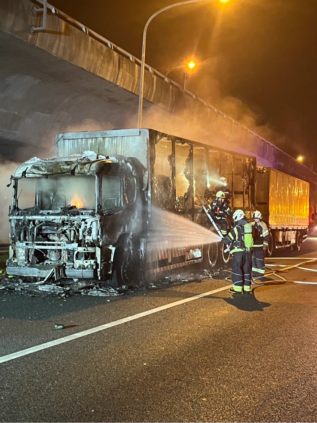 【記者曾伯愷/桃園報導】國道1號高速公路北向43.7公里林口路段,今天凌晨發生聯結車起火燃燒意外,警、消獲報趕抵佈水線撲滅火勢,整輛車燒成鐵架,所幸駕駛及時逃生沒有受傷,現場未波及其他路過人車,確切起火原因,有待火調人員調查釐清。