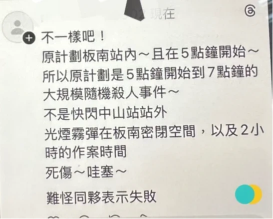台中地檢署獲報有不詳人士在昨天上午7點2分許,以「rleioutalf710902」暱稱,在社群軟體Threads留言刊登「不一樣吧!原計畫板南站內~且在5點鐘開始~所以原計畫是5點鐘開始到7點鐘的大規模隨機殺人事件,不是快閃中山站站外,光煙霧彈在板南密閉空間,以及2小時的作案時間,死傷~哇塞~難怪同夥表示失敗」等恐嚇公眾安全言論。