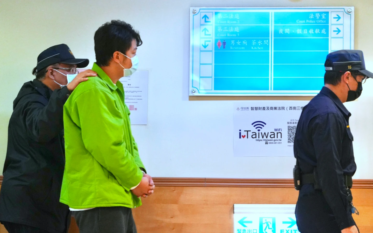 陳韋傑上午雙手上銬被提訊到智慧財產及商業法院,面對記者詢問為什麼要洩密、要認罪嗎、為什麼會想要幫忙,不發一語快步進入法庭。