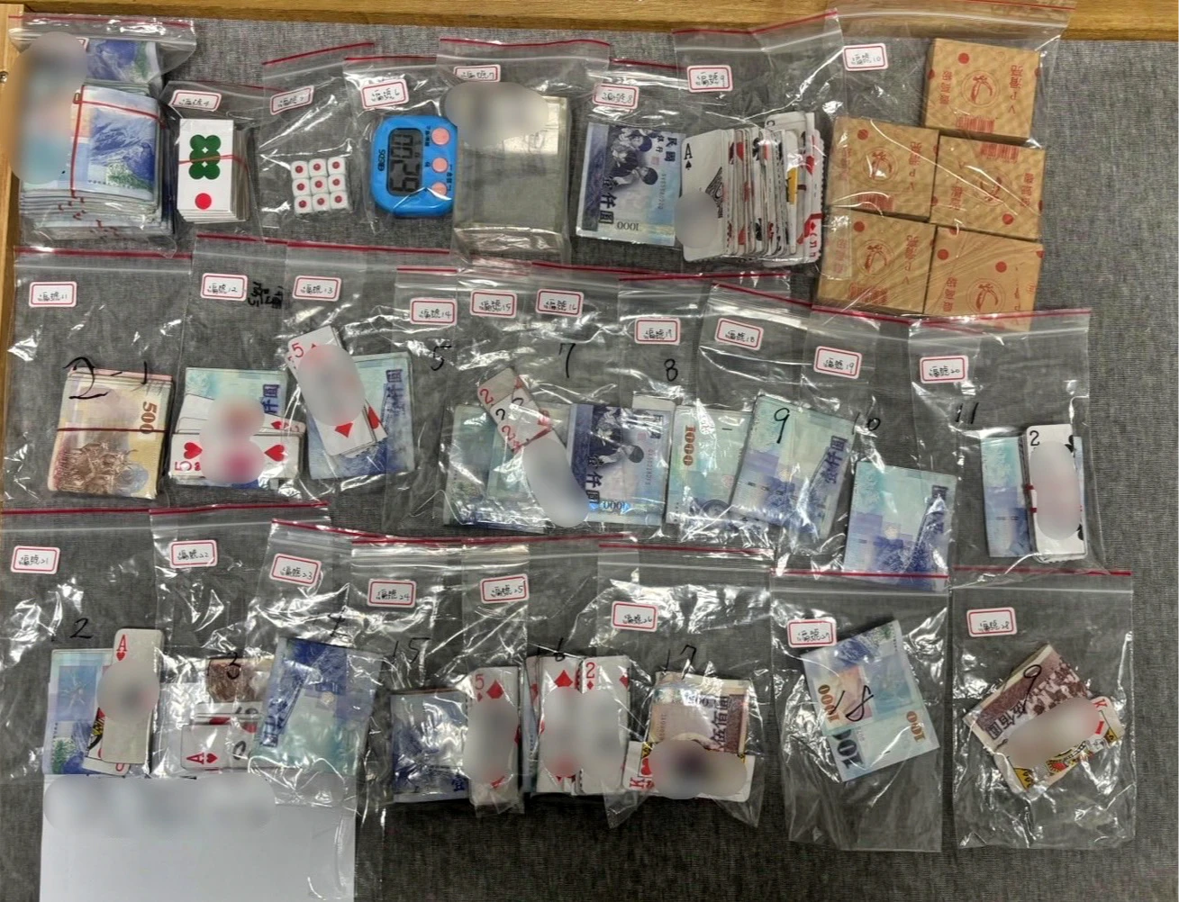 警方一共逮捕3嫌、17名賭客,查扣天九牌6副以及骰子、下注紙牌、計時器等證物。原以為是公園小賭,竟搜出31萬9900元賭資,令警訝異。