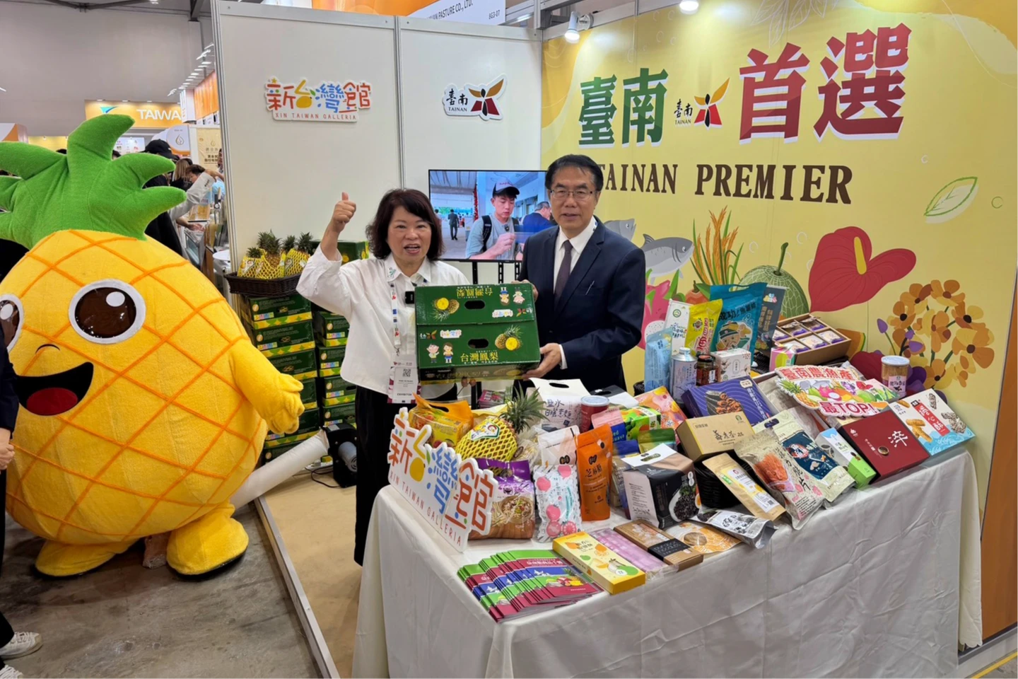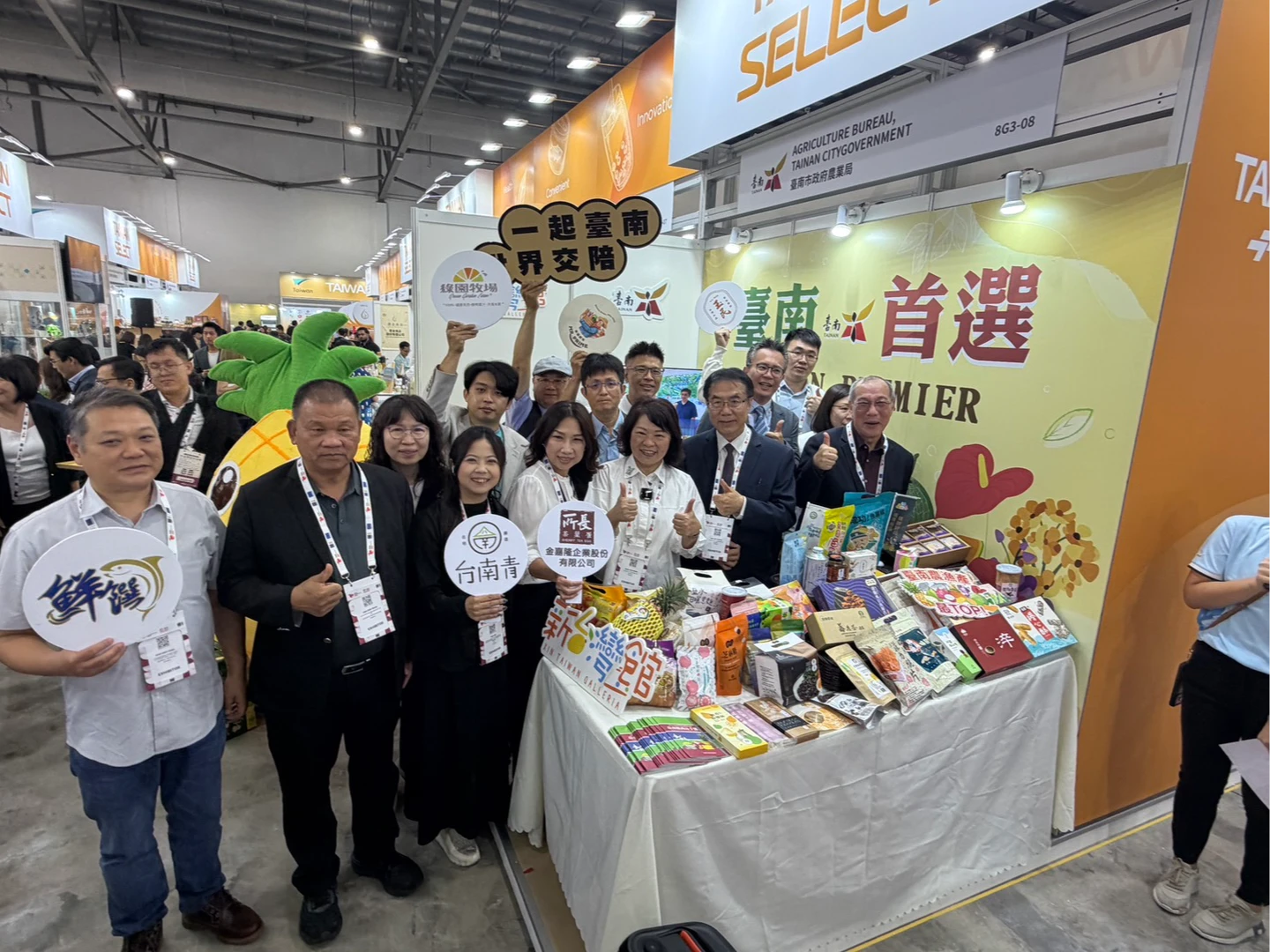 今天食品展活動中,黃偉哲率13家在地業者在台南館展示豐富物產,從冷凍水產到香甜加工果乾,吸引國際買主駐足,展現高人氣。