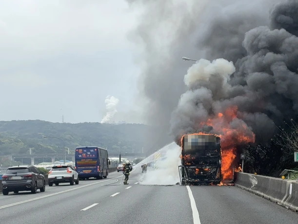 【記者陳力維/綜合報導】國道1號五楊高架南向桃園路段今(28)日中午發生一起驚險的遊覽車起火意外。一輛載滿24名乘客、由基隆南下開往高雄的遊覽車,在行駛途中引擎突然不明原因冒煙。47歲的林姓駕駛見狀,立刻將車輛停靠路肩並緊急疏散全車人員,隨後車輛便起火燃燒。警消獲報後迅速趕抵現場,於半小時內將火勢撲滅,全車25人皆順利逃生,其中1名女乘客因頭痛送醫,另有駕駛與2名乘客受輕微嗆傷或擦挫傷,所幸皆無大礙,詳細起火原因仍待警方進一步釐清。