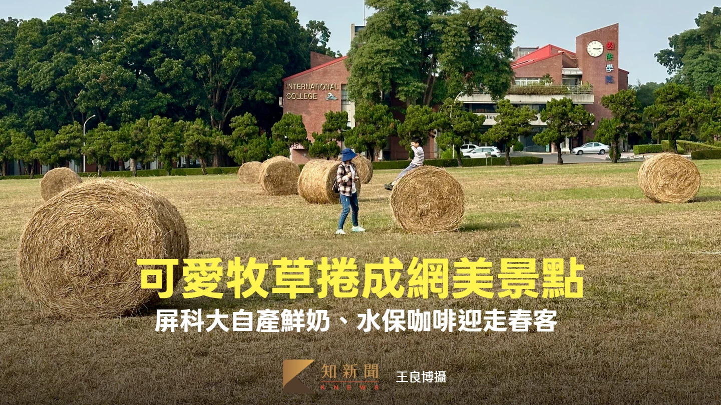 【記者王良博/屏東報導】提起位於屏東縣內埔鄉的國立屏東科技大學,許多人會想到該校知名的薄鹽醬油,除此之外,屏科大近年用校內畜牧場資源,推出鮮奶、鮮奶布丁,成為熱門商品,還結合水土保持,研發出 「水保香草咖啡」,另外,該校的牧草場在牧草收割後,會將牧草壓縮捲成「牧草捲」,散落於大片草地上,可愛模樣是適合過年走春、拍網美照的校園景觀。