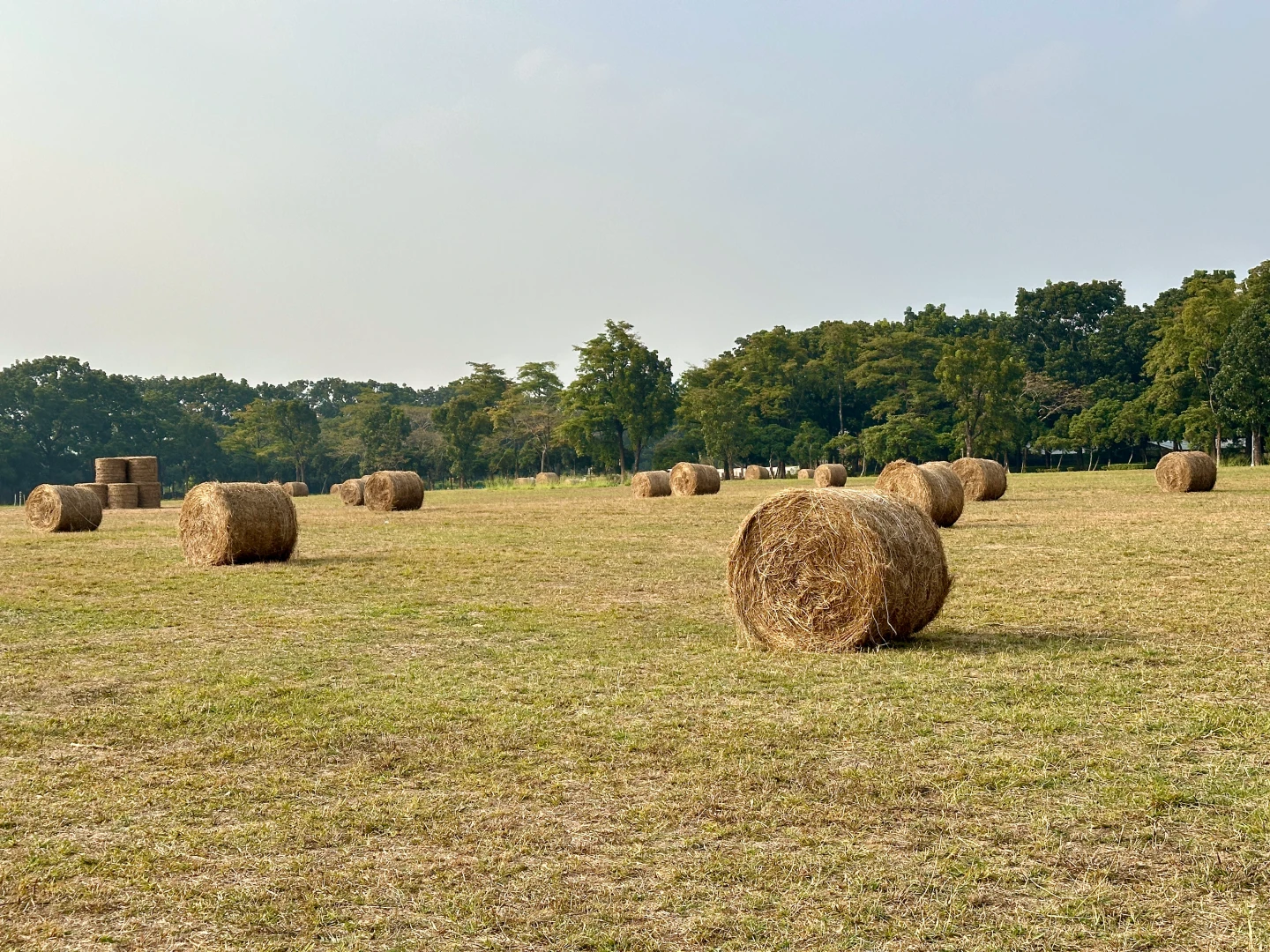不僅如此,過年期間許多民眾會到戶外走春,屏科大校內設有牧草場,主要種植盤固拉草和尼羅草,可當成動物飼料或堆肥之用,因牧草成熟後必須收割,若直接運輸會因草質鬆散,增加搬運難度與時間成本,於是每年約11月至12月間,屏科大會利用牧草打包機,將牧草壓縮後,捲成圓柱形緊密綑綁,讓搬運更加方便,也更利於儲存,形成在大草原上,有一綑綑可愛的「牧草捲」景觀。