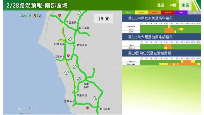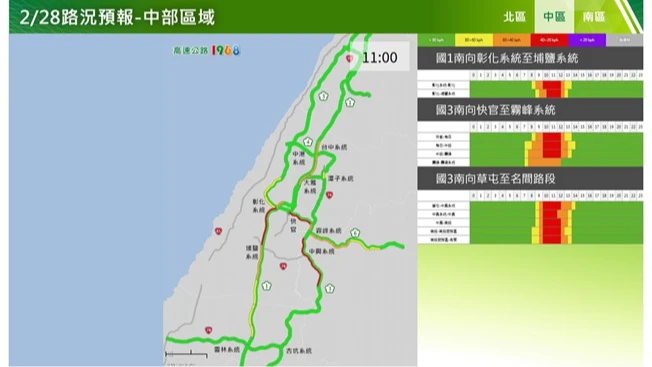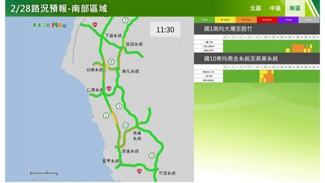 高公局預判明日重點壅塞路段,南(東)向:國1楊梅-新竹、彰化系統-埔鹽系統;國3土城-關西、快官-霧峰、草屯-名間;國5南港系統-頭城;國10鼎金系統-燕巢系統。