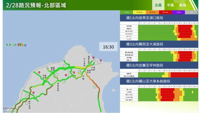 【記者劉沛妘/台北報導】明(28)日為和平紀念日連續假期第2日,高公局預估,國道交通量為107百萬車公里,為平日年平均(93百萬車公里)的1.2倍,其中北向交通量可達55百萬車公里,為平日年平均的1.2倍,重點壅塞路段出爐,其中國5北向恐從中午12點一路塞到深夜。