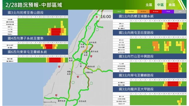 高公局建議,西部國道南向用路人儘量6時前或12時後出發;國5南向用路人建議5時前或17時後出發;另西部國道北向用路人,建議南部地區於9時前出發,中部地區於12時前出發,國5北向用路人建議於9時前出發。