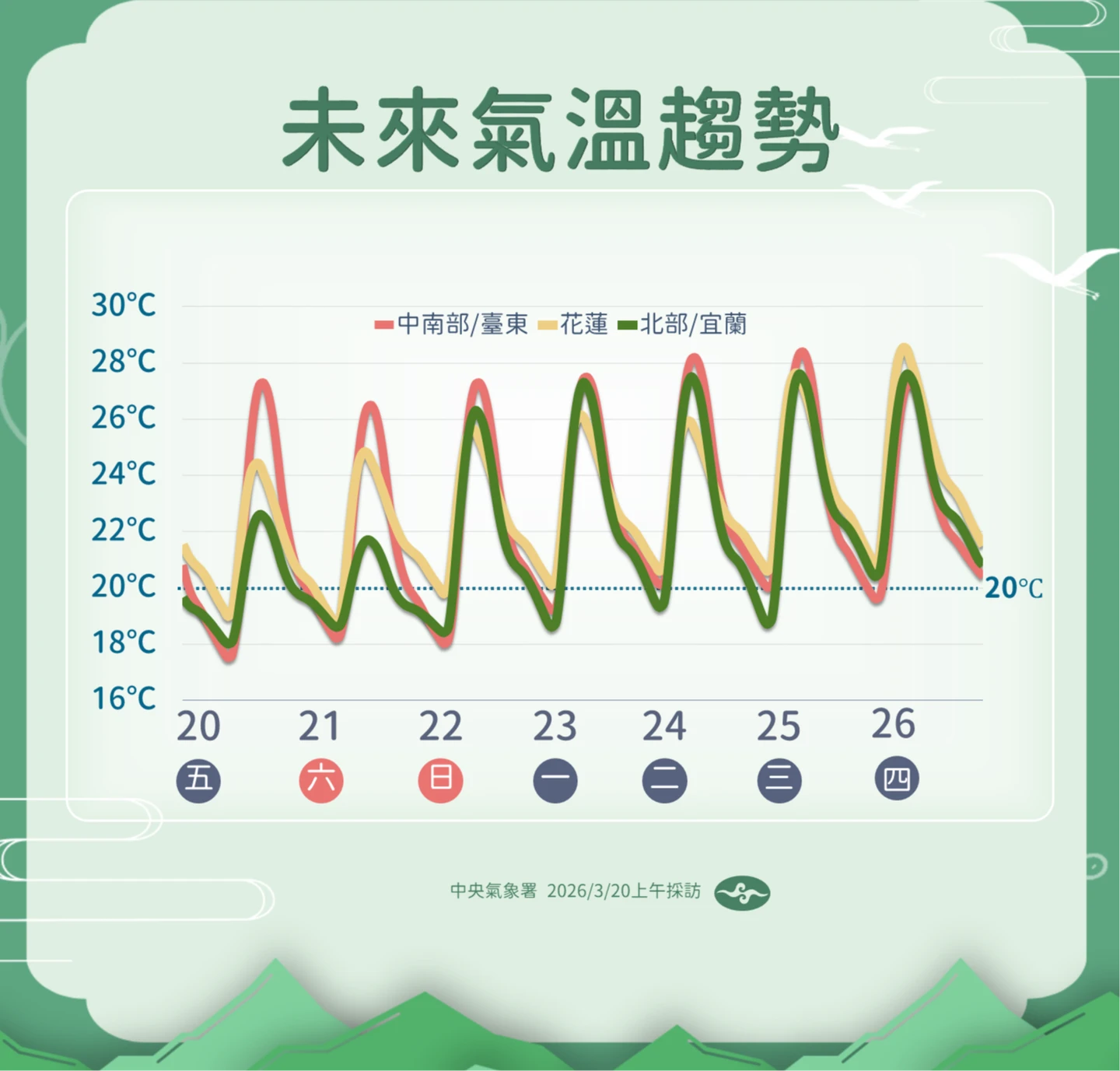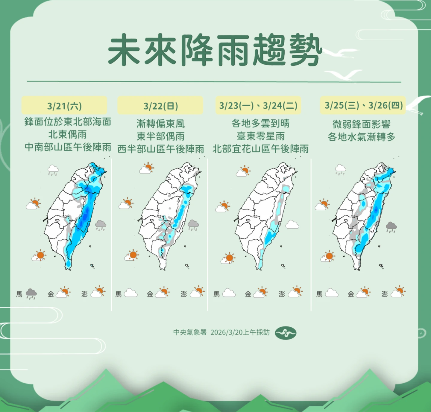 氣象署表示,今桃園以北、東半部地區及恆春半島受迎風面地形與鋒面水氣影響,不定時有局部短暫陣雨,竹苗山區也有零星降雨。北部及東北部白天感受稍涼,高溫落在20至23°C之間;中南部地區較為舒適溫暖,高溫可達25至28°C,南部近山區更可能衝破31°C。