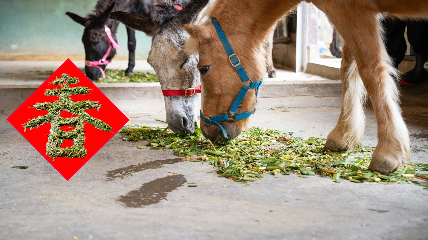 今年迷你馬與家驢的保育員更以狼尾草在地上排出「春」字,增添生肖馬年應景趣味。不過驢牽到台北還是驢,管你春不春,下肚最實在。