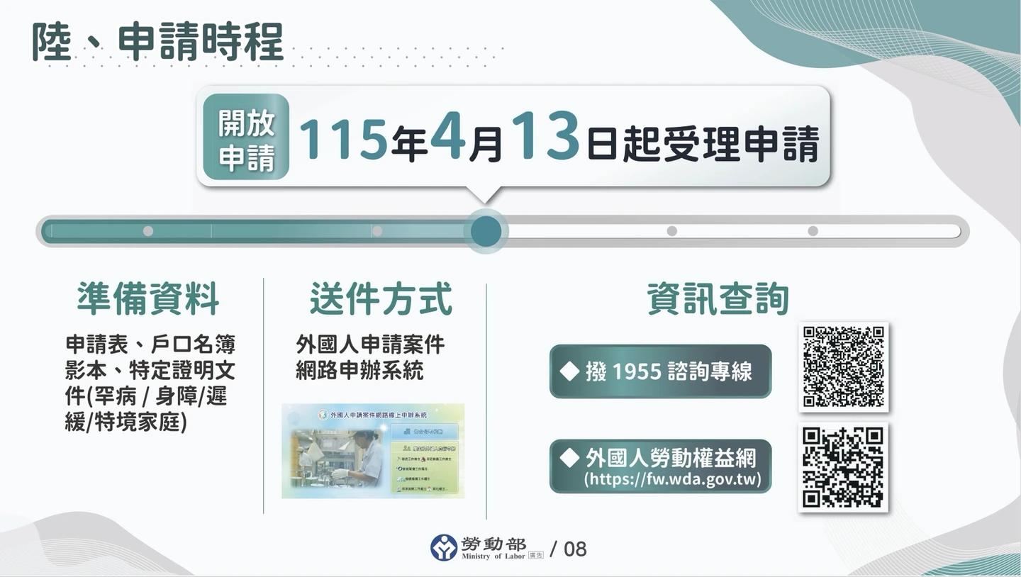 勞動部表示,將儘速完成相關法規修正、申請書表調整、資訊系統更新及各項配套措施整備,預計於4月13日起,有家庭幫傭需求的家庭完成國內求才,將開放受理申請外籍幫傭招募許可。未來持續觀察政策推動情形,適時檢討與精進。