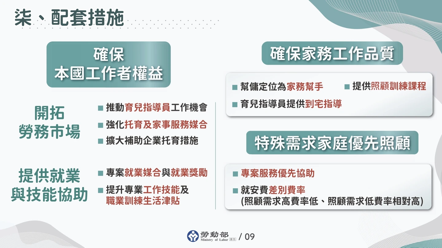 卓榮泰說明,勞動部與衛福部合作採取3項配套措施。「確保本國工作者權益」方面,將擴大育兒指導員工作機會、強化托育與家事服務媒合、提供本國工作者就業獎勵及專業技能訓練;在「確保家務工作品質」方面,幫傭工作定位為家務幫手,政府會提供基本知識知能的培訓,及育兒指導員到宅指導服務技巧;及第三,在「特殊需求家庭優先照顧」方面,採行簡化行政審查作業,專案服務優先協助及減收就業安定費等。