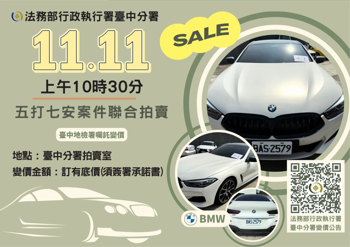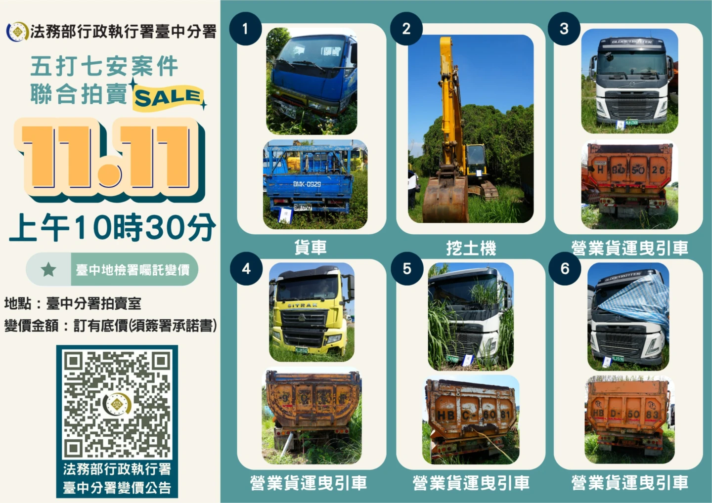 【記者王煌忠/台中報導】每年雙11已成為各大購物平台下殺優惠日子,民眾紛紛選在這一天出手搶便宜,法務部行政執行署台中分署也選在今天(11日)特別日子,盛大舉行「雙11五打七安」聯合拍賣會,成功將詐團犯罪工具、滯欠稅金、罰鍰車輛變價,包括違反廢清法的挖土機、毒駕馬自達自小客、詐騙集團BMW轎車,全數成功拍賣,總拍定金額高達1343萬9500元。