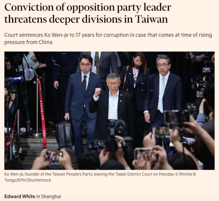 外媒關注柯文哲遭判17年 《金融時報》、《日經亞洲》:加劇台灣分裂