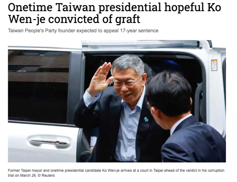 【編譯張翠蘭/綜合外電】前台北市長、民眾黨創黨主席柯文哲因涉京華城案,周四(3/26)遭台北地院一審重判17年,《日經亞洲》、英國廣播公司(BBC)、《金融時報》及路透社等媒體均報導此判決,並評論指出,此案正值台灣面臨來自中國日益增長的壓力之際,預料將進一步加劇台灣的政治分裂。