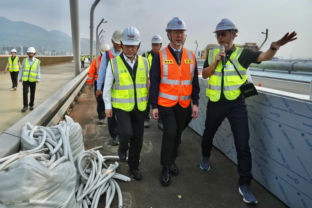 公路局北區公路新建工程分局分局長陳永傑今(4/9)說明,5月12通車絕對沒問題,但中間遇到民眾關切的風切聲問題,其因來自,114年12月16日開始安裝人行到扶手,115年1月大面積安裝後產生風切聲,設計單位及「淡江大學風工程研究中心」於115年1月27日至現場勘查,研判風切聲是因為欄杆鋼板排列規則且密集,在特定風速與風向條件下,氣流與欄杆產生共振所引起,為何要參考美國舊金山大橋案例,就是因為該大橋的扶手欄杆也是片狀式,也會觸發共振。