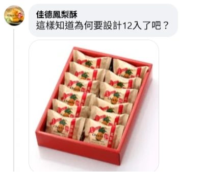 該文讓一堆人笑歪,紛紛獻策「台中不是12罐東泉嗎?」、「彰化12個肉圓會不會太飽」、「桃園12片豆乾嗎」、「嘉義12碗雞肉飯」、「台東是要塞12顆釋迦膩」,有人認為「台南:所以難點在哪」,就連佳德鳳梨酥都來留言,「這樣知道為何要設計12入了吧?」