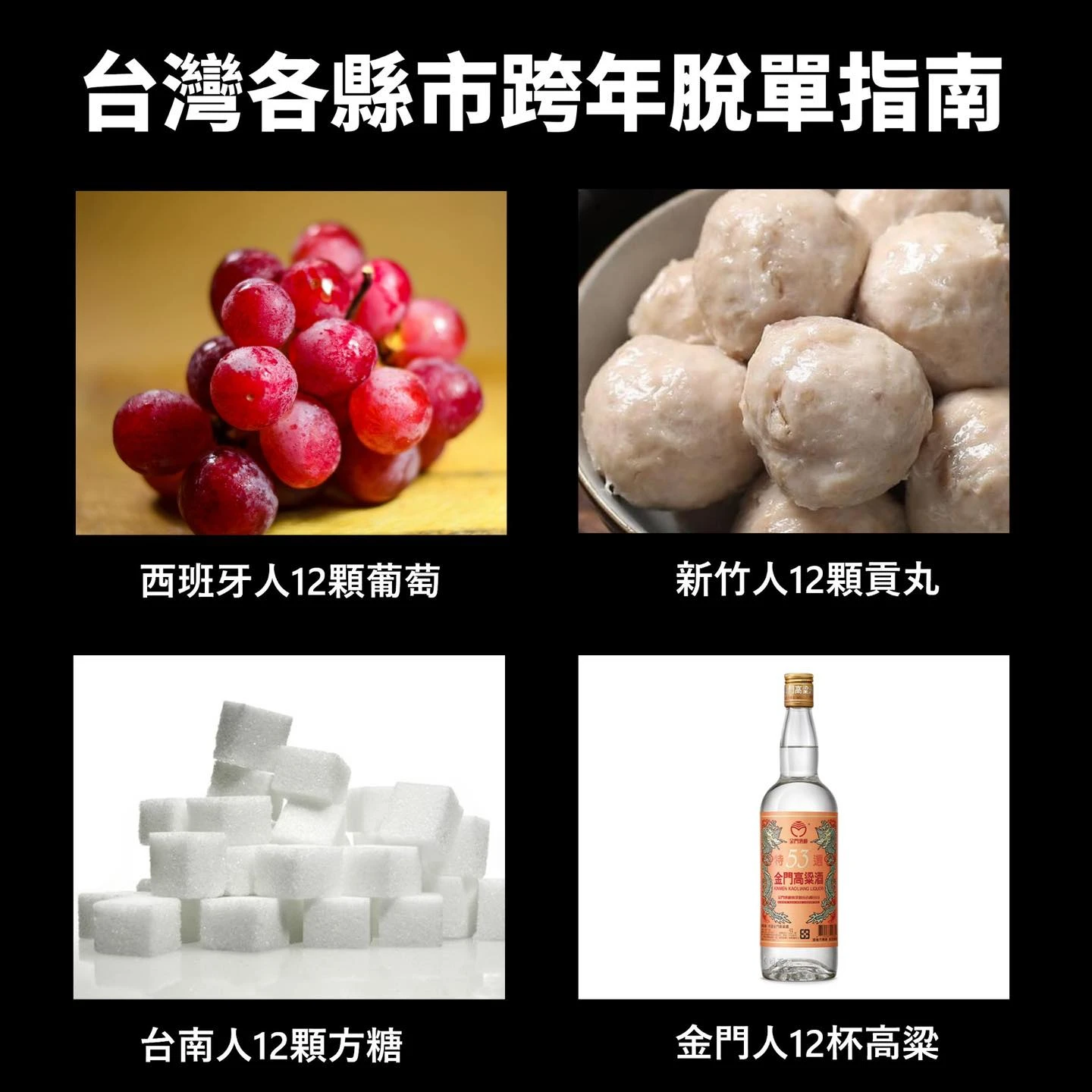 「12顆葡萄」許願夯,各縣市也參戰,「Big City遠東巨城購物中心」小編製作各縣市跨年脫單指南,指出既然西班牙要12顆葡萄,那新竹就是12顆貢丸、台南人12顆方糖、金門人12杯高粱,「台中就是12片太陽餅不准配水,ok吧。」