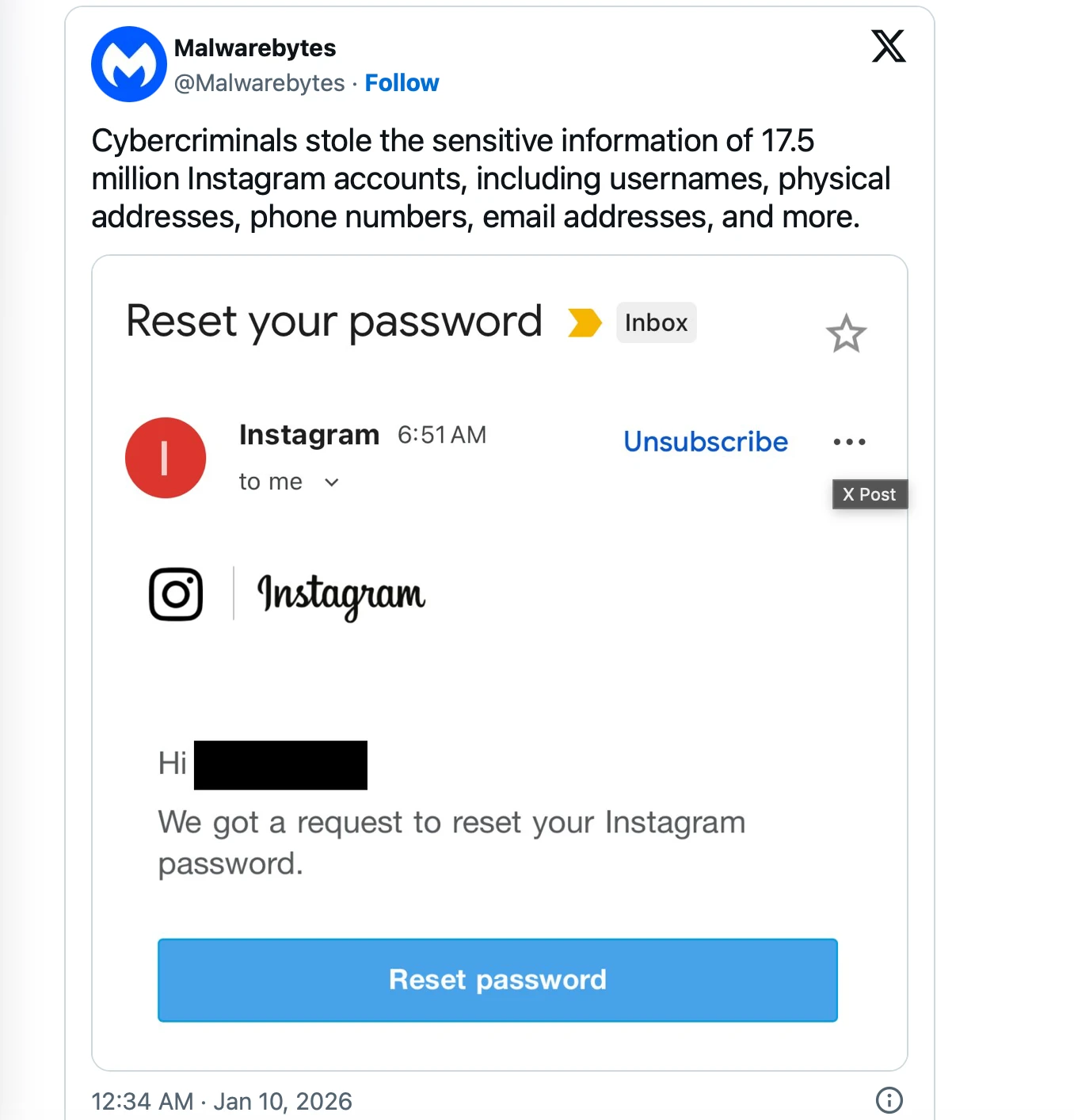聯絡資訊遭外洩的用戶,未來可能會收到看似正常的電子郵件或訊息,誘導其重設密碼或驗證身分。Malwarebytes指出,已有部分受影響用戶收到Instagram的密碼重設通知,這些通知可能是真實的系統訊息,也可能是惡意行為者濫用機制所致。