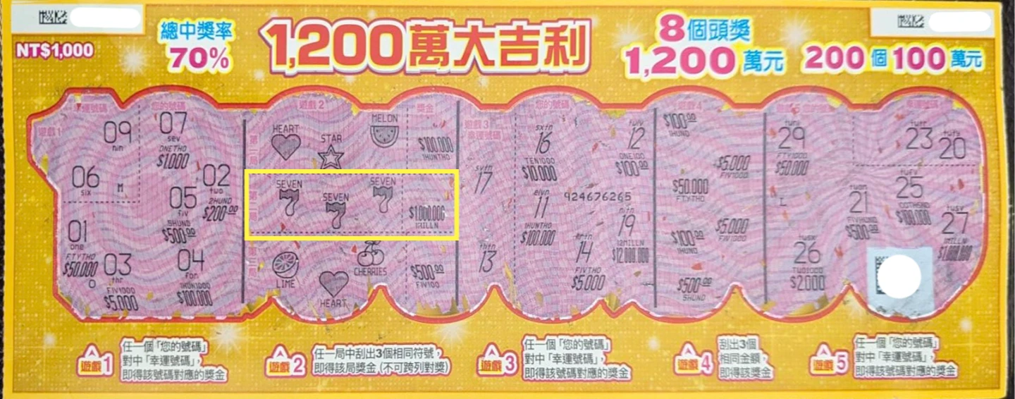 此外,南投縣埔里鎮鑫勇得彩券行代理人蔣小姐表示,一名年約30多歲的男子,原本在彩券行內刮「1200萬大吉利」刮刮樂,聽到店員在討論「五路財神」刮刮樂上的財神爺圖像,跟店裡供奉的財神爺有幾分相似,決定加買一張尾數8號的「五路財神」刮刮樂。