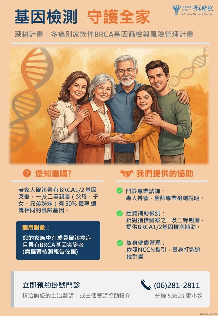 奇美醫院精準醫學中心主任李健逢表示,婦人具「BRCA基因突變」,子女與手足有高達50%的遺傳機率。院方為此通知婦人3名姐妹前來基因檢測與風險評估,藉由提前掌握健康風險,讓家族成員能及早展開預防、追蹤與管理,預先築起癌症防線。