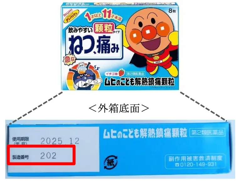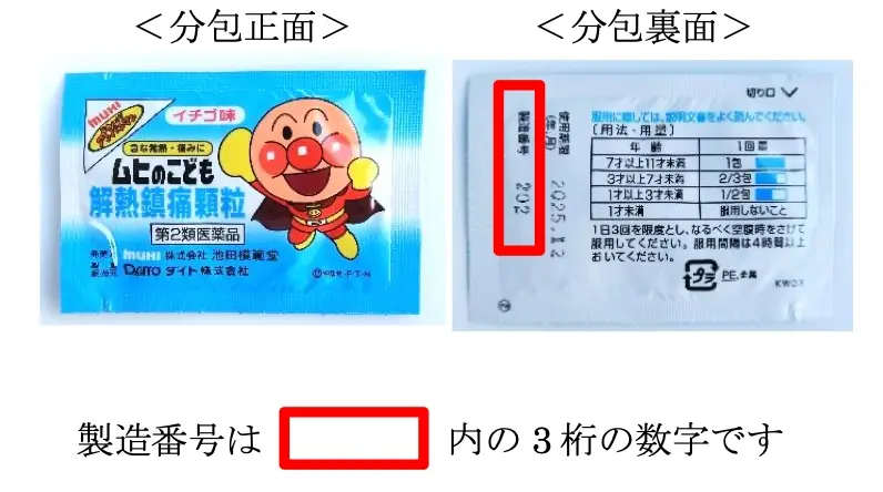 池田模範堂主動回收的「無比兒童解熱鎮痛顆粒」,為製造號碼101、102、103、201及202的產品,使用期限為2025年5月到12月,總計15萬1220盒。