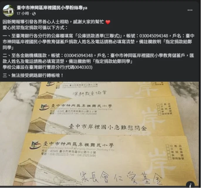 校方於臉書粉專指出,媒體報導後引發各界善心人士相助,因此公布愛心捐款方式: