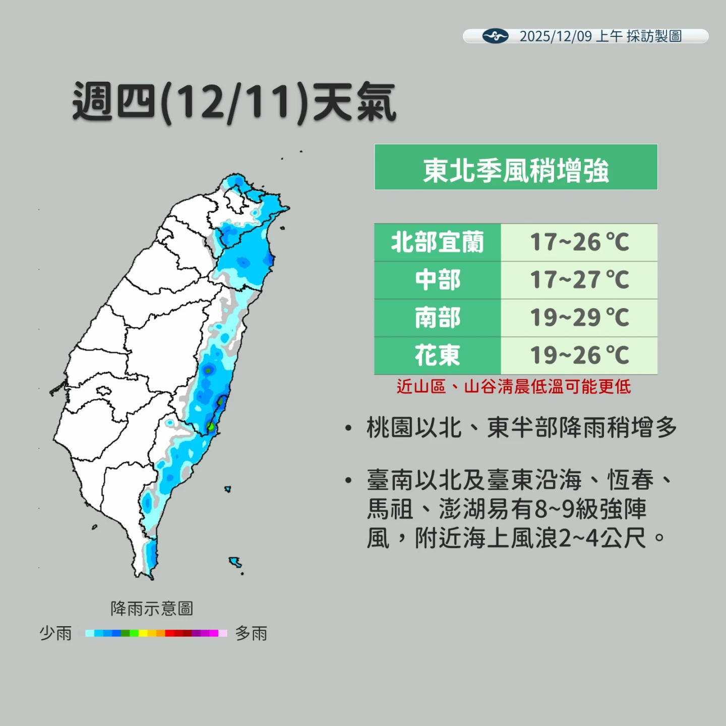 周五(12日)至周六(13日)白天,東北季風持續影響,北部及宜蘭天氣稍涼,其他地區早晚也涼。水氣仍偏多,北部、大台北山區、東半部地區及恆春半島有局部短暫雨。其中,基隆北海岸、大台北山區及宜蘭地區降雨有局部較大雨勢發生的機率。周六(13日)晚上,隨著更強冷空氣南下,氣溫將「溜滑梯式」下降。