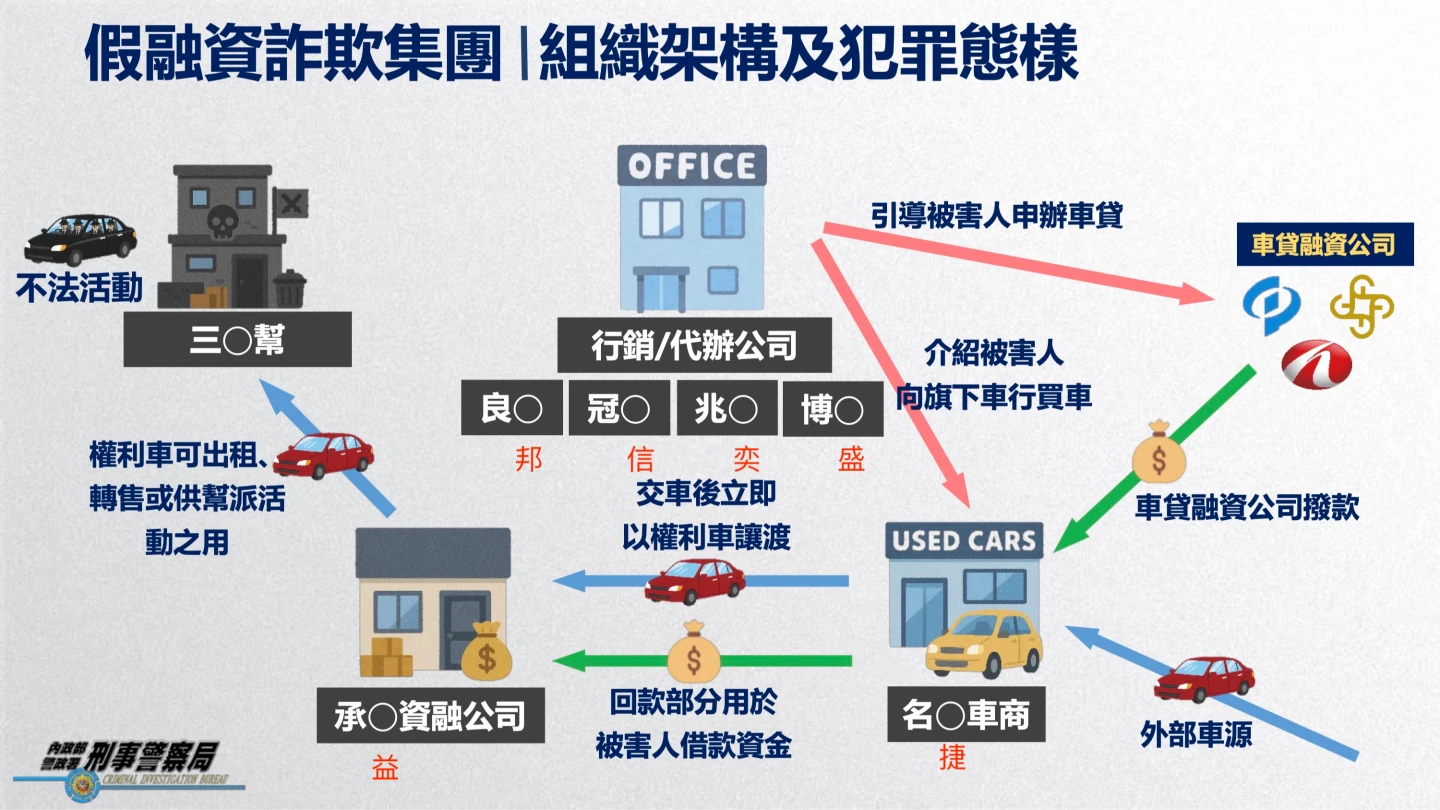 據指出,沒有擔保品的民眾,吳男等人就會以信用不佳為由,介紹「假購車貸款方案」,誘騙民眾申請不實購車貸款,等成功核貸購車後,由融資公司出面放款,並要求將車輛讓渡予融資公司作為擔保。吳男等人還會收取核貸金額3成作為代辦費,另外包括開辦費、顧問費、手續費等不合理虛假費用,層層剝削。