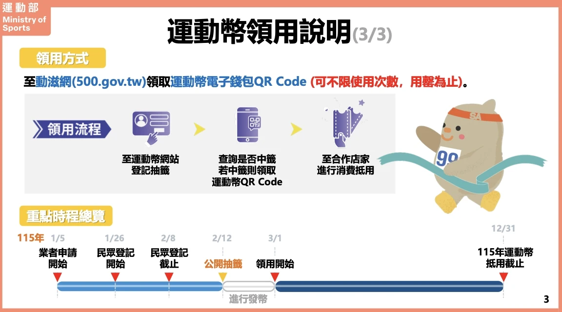 在今日登記截止後,運動部規劃於2月12日(週四)進行公開直播抽籤,以確保流程的公平與透明。幸運中籤的民眾,自今年3月1日起即可前往合作店家進行消費抵用,使用期限將持續至115年12月31日止。目前運動部也持續鼓勵符合資格的「添裝備」相關業者申請成為合作店家,只要經審查通過,即可自3月起收受運動幣。