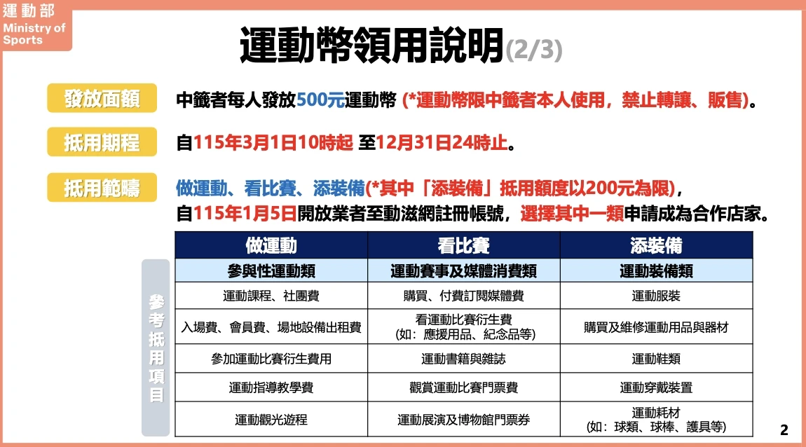 《知新聞》報導,為了提升使用率並照顧不同產業,「運動幣」的使用範圍除了延續過去的「做運動」與「看比賽」且可全額抵用外,今年特別重啟了「添裝備」項目。民眾中籤後可用於購買運動服裝、鞋類、器材或穿戴裝置等,但為了避免資源過度集中於單一業別及大型廠商,該項目設有抵用上限,每人最高可折抵200元。運動部次長黃啟煌指出,此舉是希望能擴大經濟效益,同時避免單一廠商壟斷。