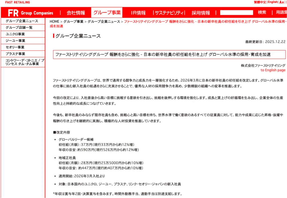 UNIQLO母公司應屆畢業生薪資漲12% 年薪上看118萬!搶職場新人才