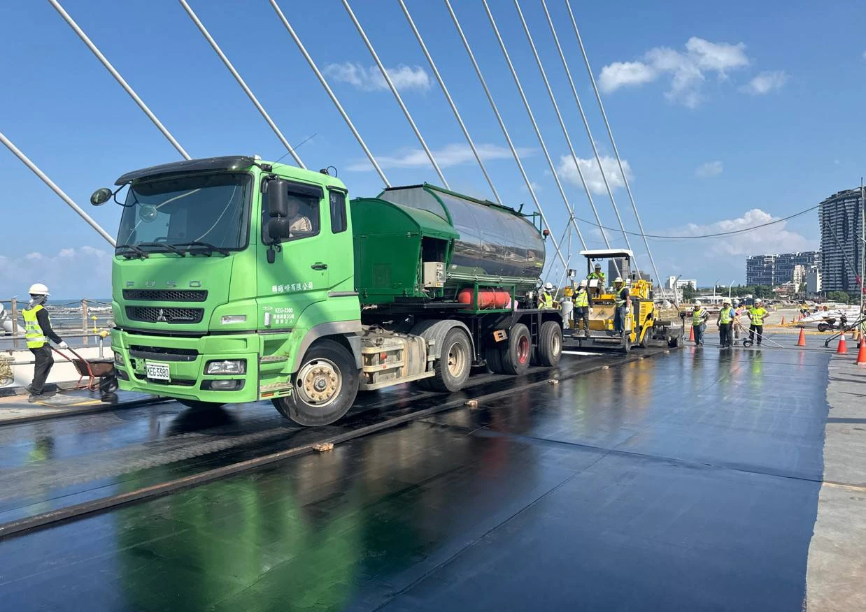 【記者陳怡文/台北報導】淡江大橋工程進入最後關鍵階段,公路局北區公路新建工程分局於11月16日啟動鋼床板GUSS瀝青混凝土鋪面作業,施作區段為5K+895至6K+539,全長約640公尺。此次鋪面作業預計工期不含天候因素約45天,將於2025年底完成,2026年2月完成景觀燈柱安裝與3次斜索索力調整,2026年4月完成塔吊拆除、金屬護欄、伸縮縫與人行道設施等附屬工程。