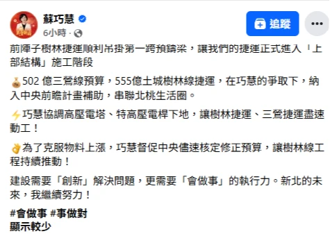 蘇巧慧指出,不過因應原物料價格上漲,新北市政府針對土城高架段工程(CQ880B)提出追加預算的需要,她當面要求行政院加速核定捷運土城樹林線財務修正計劃,讓行政院在2025年10月底正式核定財務修正計畫,在同年年底迎來全線動工。