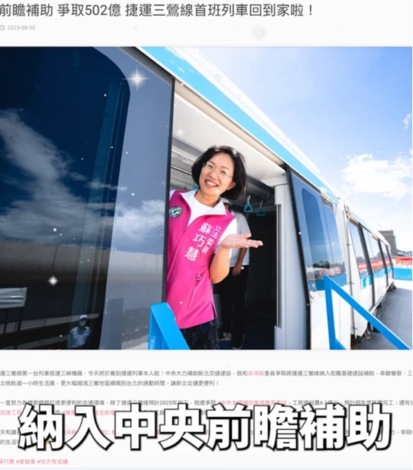 另外,針對全長14.29公里,總經費502億元的捷運三鶯線,蘇巧慧則說,同樣是在她爭取下,才納入中央前瞻基礎建設計畫,目前施工進度已突破九成,她期盼今年能順利通車。