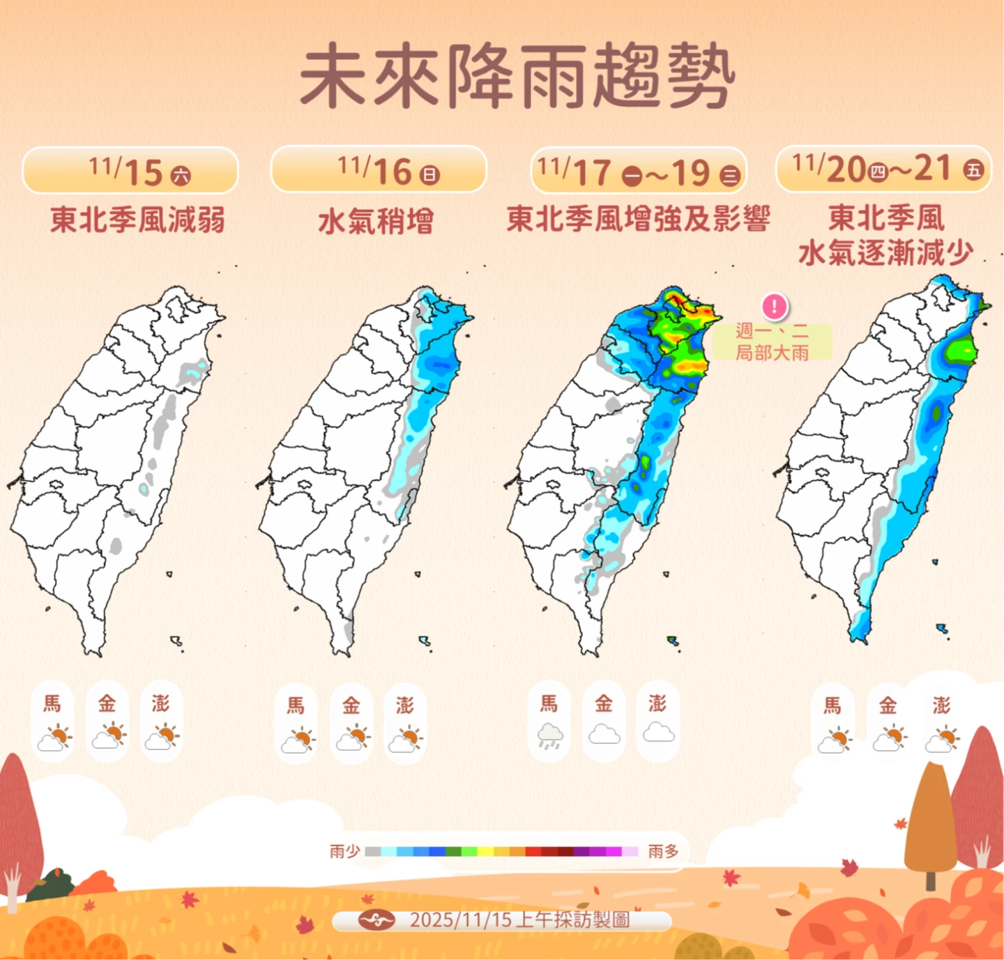 吳德榮指出,預計到了20日、21日,迎風面的水氣將會減少,天氣可望逐漸好轉。東北部仍有零星降雨的機率,各地白天氣溫將會回升,但早晚仍會維持微冷的感受。