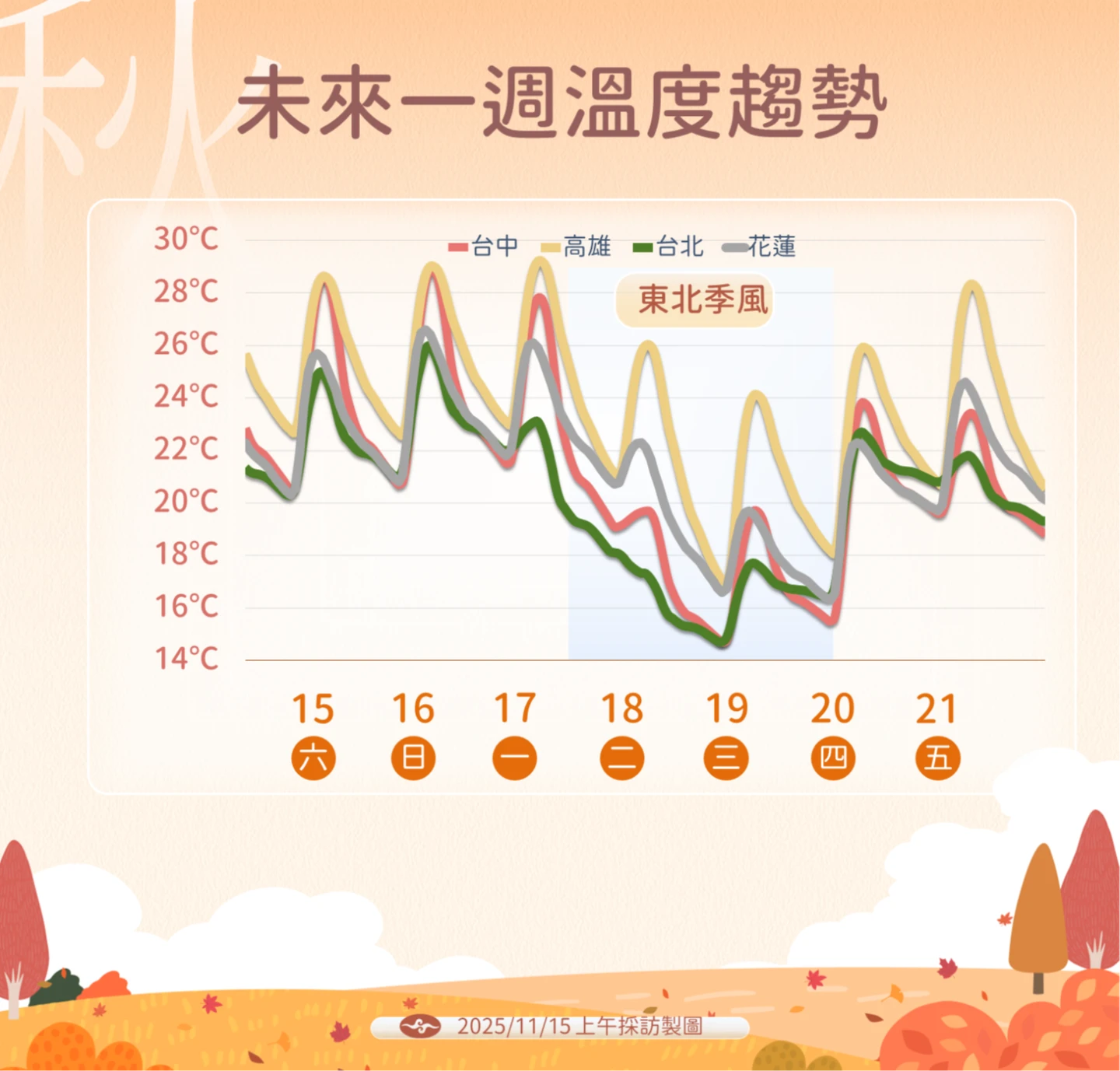 【記者陳力維/綜合報導】交通部中央氣象署表示,今天(11/15)受周六到東北季風減弱影響,各地大多呈現晴到多雲、溫暖穩定的天氣型態,僅東半部地區雲量略多,偶爾有零星降雨。氣象專家吳德榮也指出,今、明兩天東北季風減弱,各地將是晴朗舒適、秋高氣爽,整體白天舒適微熱,早晚感受較涼,但下周一入秋最強冷空氣報到,苗栗以北平地低溫下探13度。
