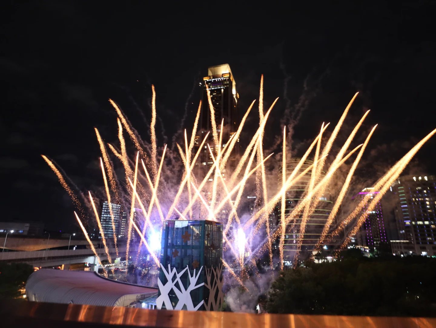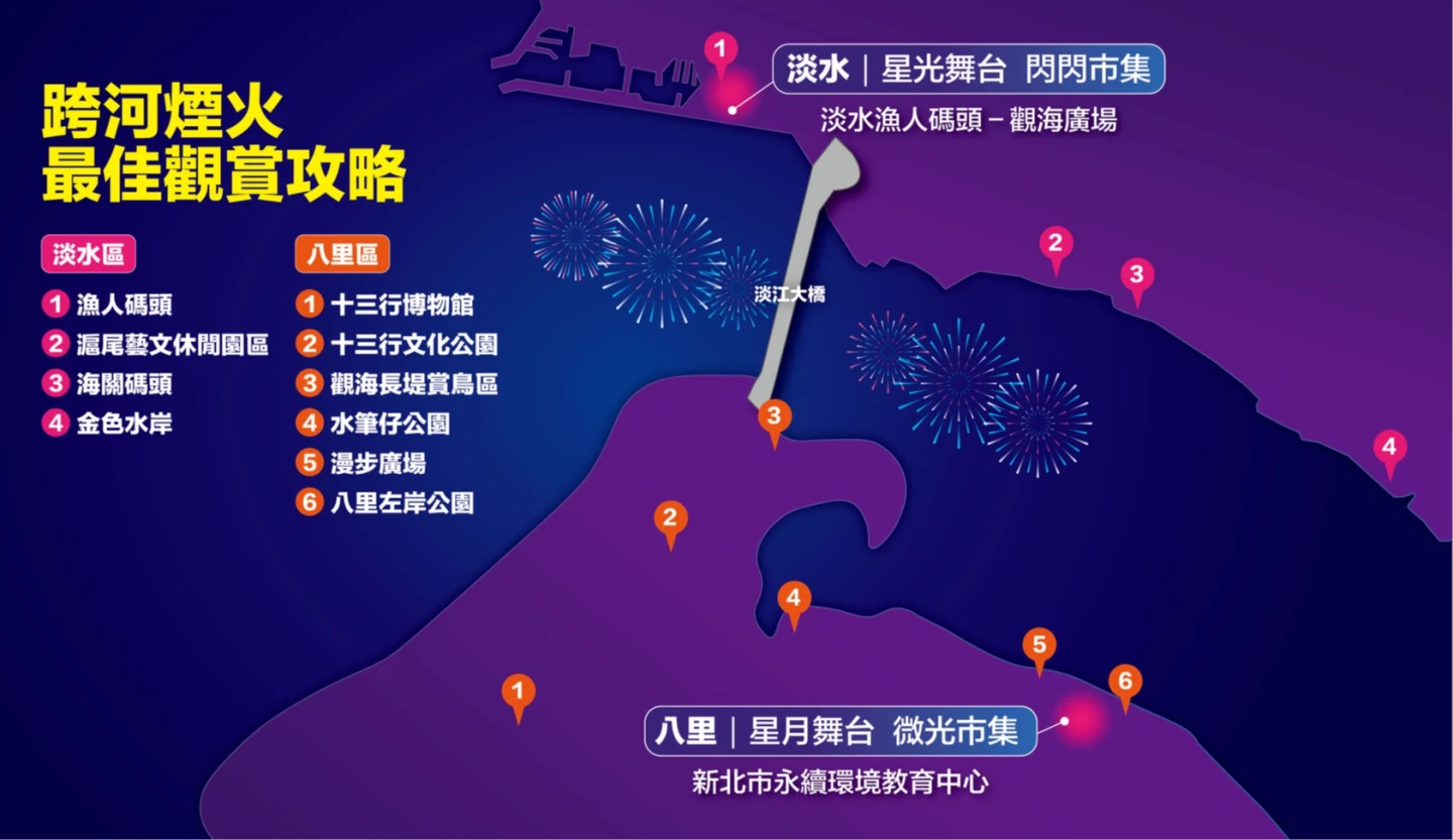 而萬眾矚目的跨年煙火秀則將在晚間8時26分施放,今年主題《萬花之河‧冬之樂章》,煙火總長13分14秒、共35,520發,創下歷年最多紀錄,並將在淡江大橋左右兩側規劃煙火施放區,展現出橋河共演的壯闊視覺效果,帶給觀眾360度沉浸式的視覺體驗。